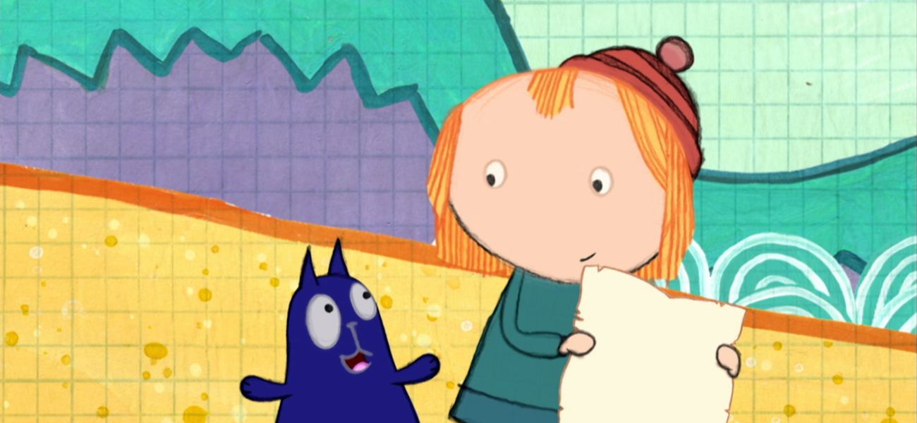 Peg and Cat search for a treasure on a desert island. Peg must use the map and the ruler in her possession to measure the path.