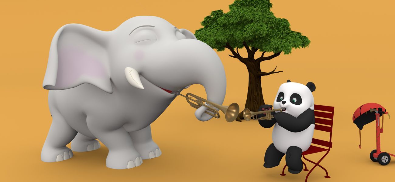 Lilou Bambou pedals to Mr. Elephant, who blows his new trumpet. He invites her to discover the instrument with him.