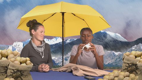 Seana essaie d'identifier les objets qu'Annick D'Auteuil a mis dans la poche à patates.