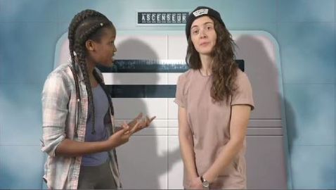 Going up on an elevator, Annie Guglia must pitch the characteristics of her job of professional skateboard athlete to Seana, in order to convince her that it is an interesting job!