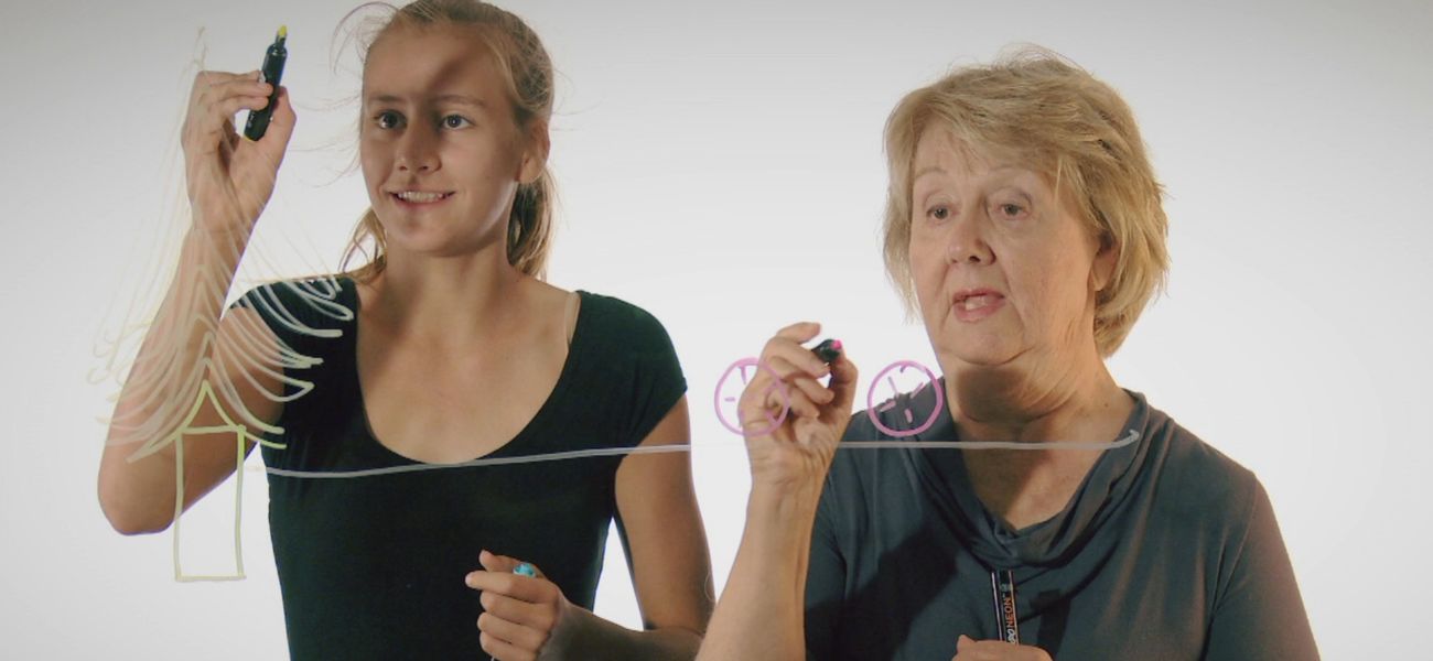 Jasmine and her grandmother Lucie draw a memory they share, gardening at grandma's, and tell the story.