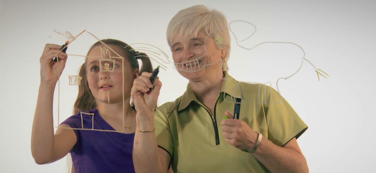 Jasmine and her grandmother Lucie draw a memory they share, gardening at grandma's, and tell the story.