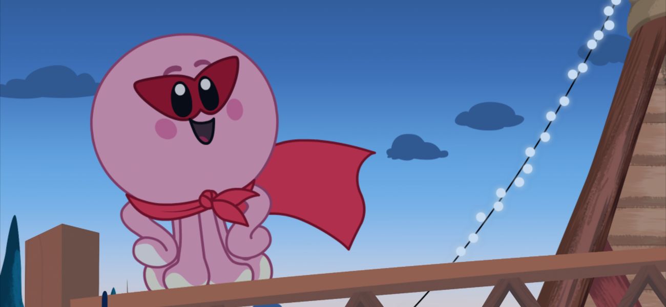 Poulpi crams into a T-shirt and topples over. Oh, saperlipoulpette! It would be so cool if she didn't have tentacles. When the Adventurers offer to help with Mireille's movie night, Poulpi ties her tentacles together. Now she's just like everyone else - she's got two feet! But as she knits the cinema screen, Poulpi loses her balance and unzips it. She then helps Luna prepare the hot dogs and drinks, but stumbles and sends the food flying. Finally, Bric asks Poulpi to pedal the projector bike, but her attached tentacles tip her over once more, bringing the film to a halt. Nooo! Can Poulpi learn to love her tentacles and save the film in her own way?