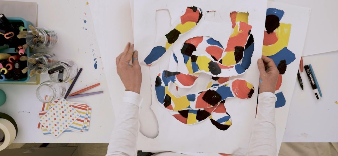 Hervé Tullet pulls paper to see where it's taking it and creates a path.