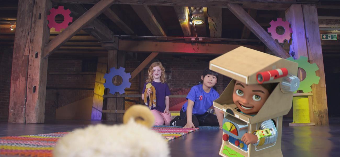 Bitz and Bob remember one of their adventures where they had to make a giant sledge to slide on the snow. In a studio, children are trying to recreate a similar project to slide plastic objects. They note that the surface choice is essential for the success of the experiment.