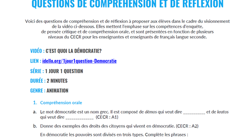 This resource presents questions related to the video C'est quoi la démocratie? from the 1 jour 1 question series. They focus on students' inquiry, critical thinking and listening skills and are presented according to several levels of the CEFR.