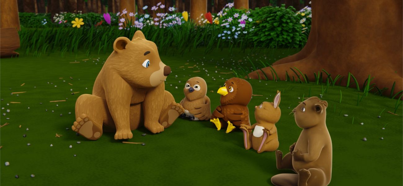The chums meet a young bear with very ticklish feet. They compete in ingenuity to help their new friend.