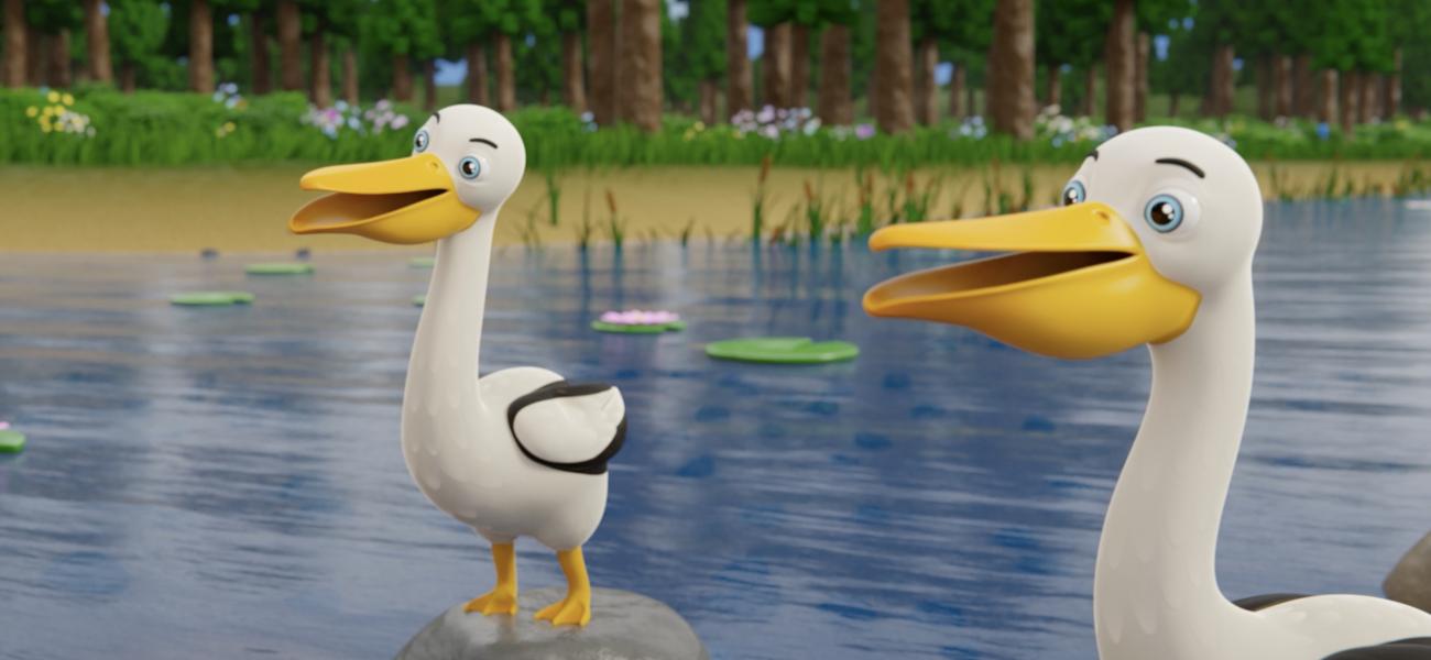 Cedric and Irène go fishing and discover that pelicans have taken over the lake. The chums must work together to find a solution so they can continue to share the lake.