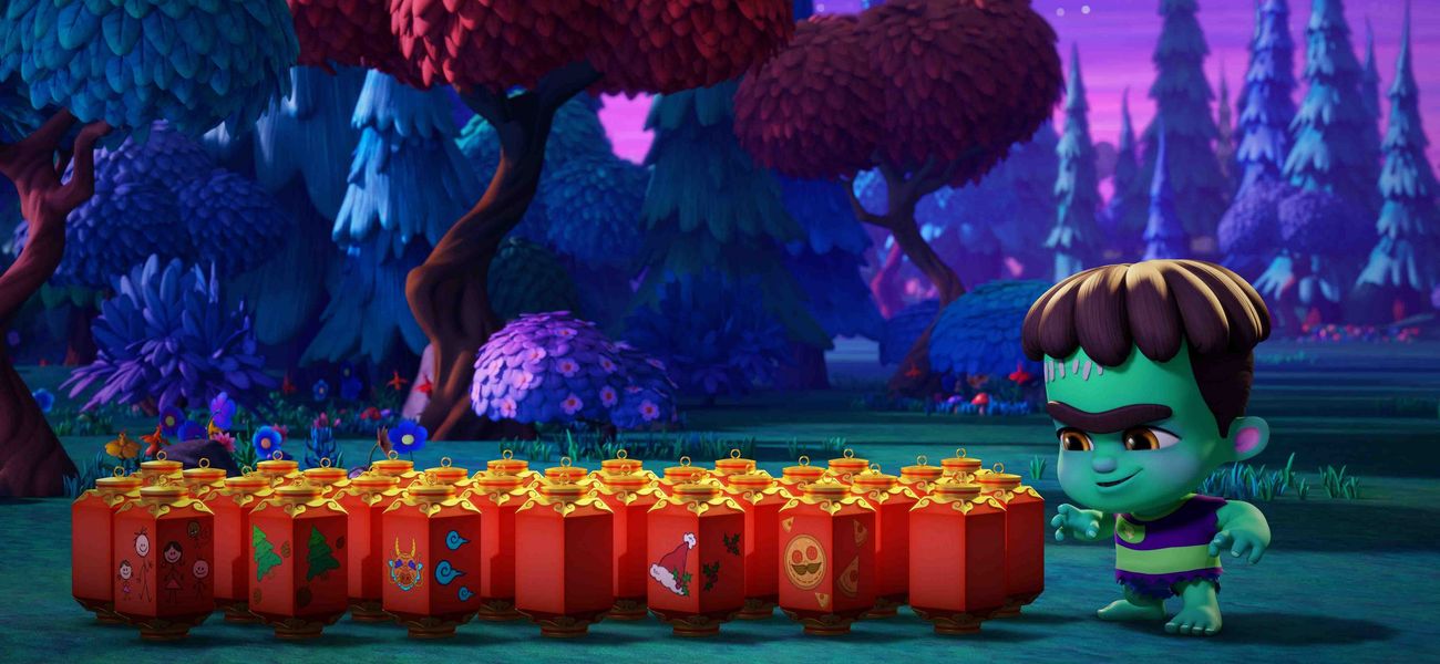 Later that evening, the Super Mini Monsters use their super powers to help their friends and neighbors send cards to loved ones who live far from Pitchfork Pines.