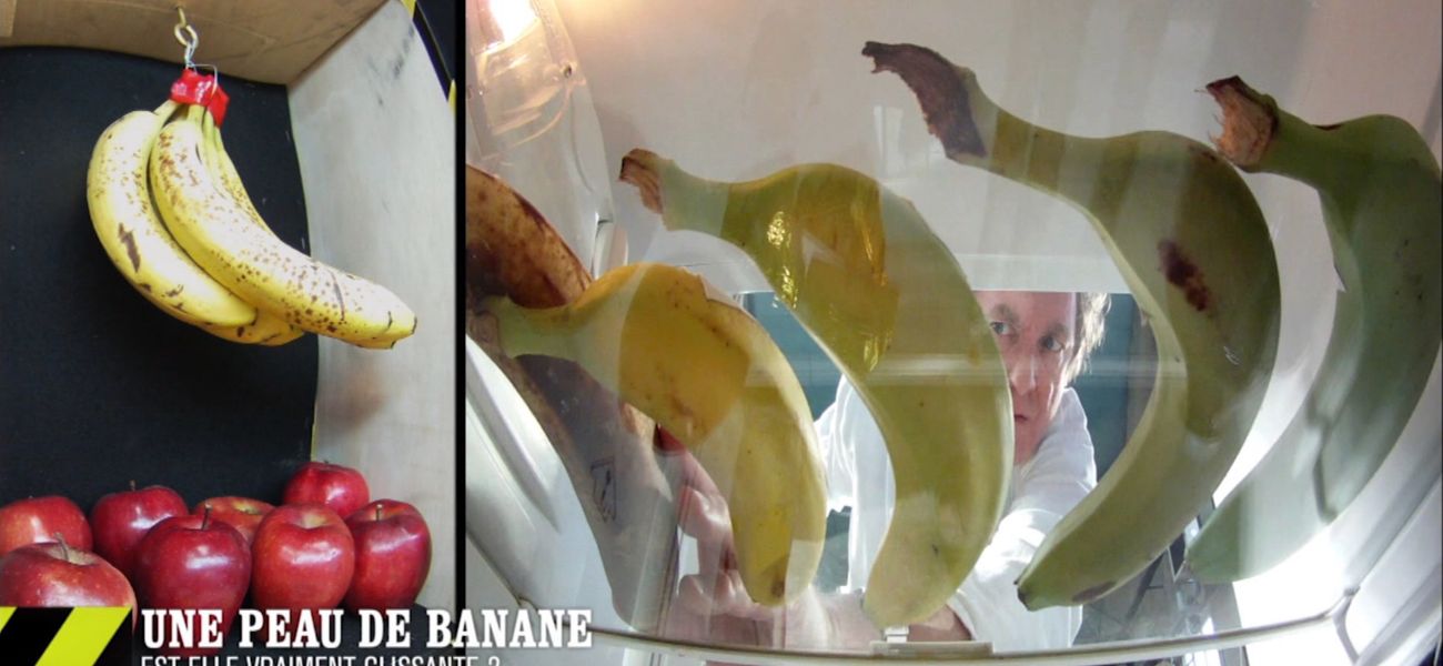 Nos cobayes vont décortiquer des bananes afin d'analyser leur peau. Sont-elles vraiment glissantes? Pour le savoir, des tests géants sont organisés au laboratoire avec une course au milieu de centaines de peaux de bananes. Pas sûr que David et Vincent aillent au bout de ce défi sans glisser.