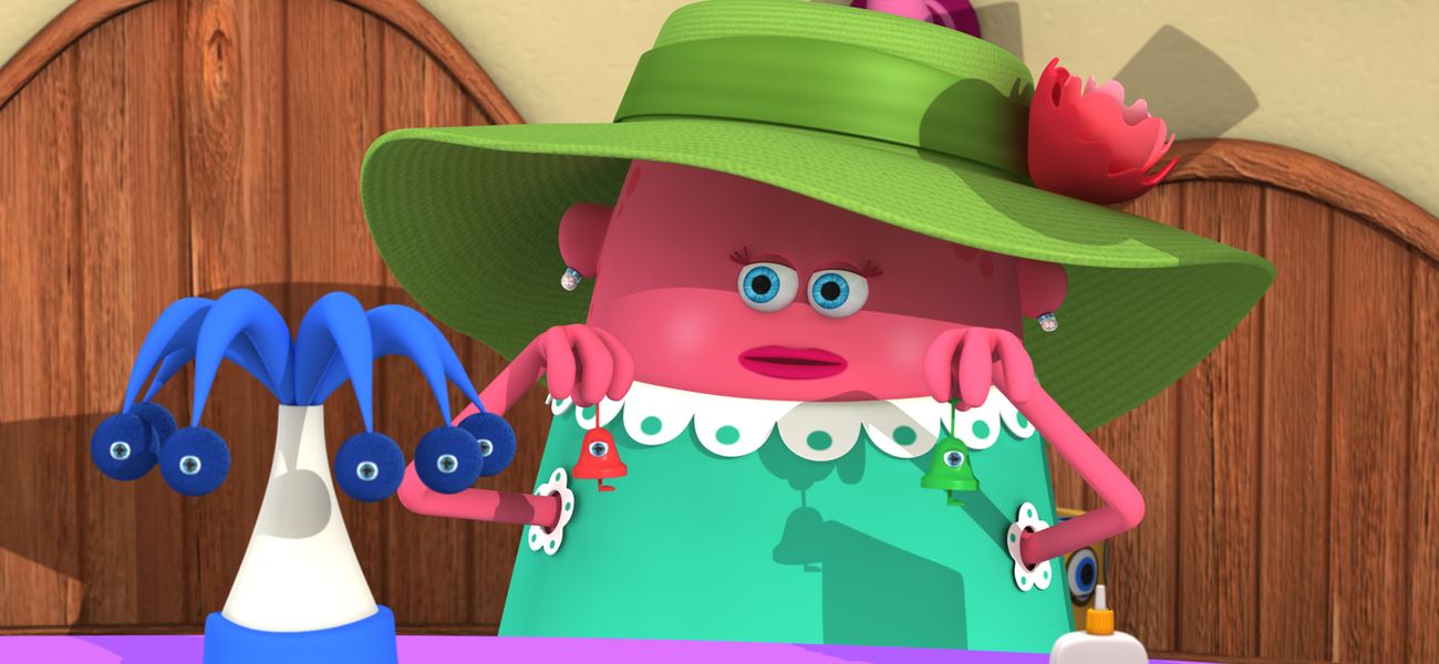 Concept: matching. Miss Hattie Monster is trying desperately to complete three hats for her next customer, but for some reason, the Jingle Monsters and the Puff Monsters keep jumping off the hats! The Monster Math Squad helps Miss Hattie Monster by MATCHING the right number of Jingly Monsters to the right number of Puff Monsters on each hat.