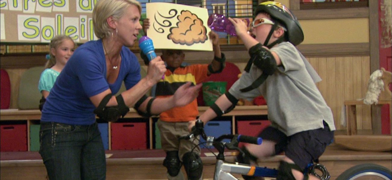 Dans cette émission, Carmen pose la devinette d'un casque protecteur à Pomme-Pomme. Les enfants rencontrent une cycliste qui dramatise sur une bicyclette stationnaire, la course de neuf kilomètres du Centre-Soleil. Les enfants chantent avec Carmen « La chanson du vélo » et font différentes activités. À la fin, Carmen lit aux enfants l'histoire : « Vladimir en vélo » pour développer la conscience des phonèmes « o et eau ».