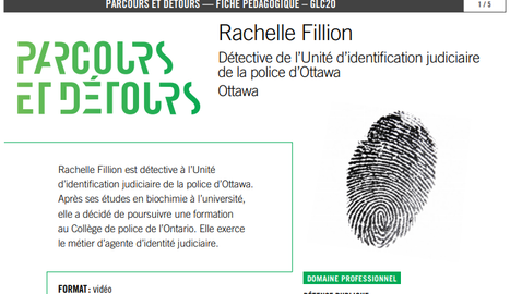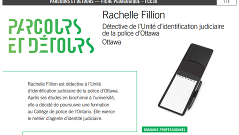 Entrevue : Rachelle Fillion est détective à l'Unité d'identification judiciaire de la police d'Ottawa. Après ses études en biochimie à l'université, elle a décidé de poursuivre une formation au Collège de police de l'Ontario. Elle exerce le métier d'agente d'identité judiciaire.