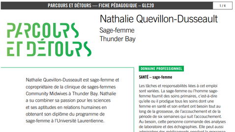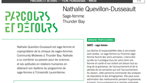 ·(Entrevue audio) Nathalie Quevillon-Dusseault est sage-femme et copropriétaire de la clinique de sages-femmes Community Midwives à Thunder Bay. Nathalie a su combiner sa passion pour les sciences et ses aptitudes en relations humaines en obtenant son diplôme du programme de sage-femme à l’Université Laurentienne.