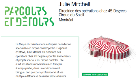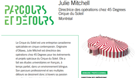 ·Le Cirque du Soleil est une entreprise canadienne de divertissement artistique spécialisée en cirque contemporain. Originaire d'Ottawa, je suis directrice des opérations chez 45 Degrees pour les événements et projets spéciaux du Cirque du Soleil. J'ai fait mes études universitaires en français, à temps partiel, dans un environnement bilingue. Ainsi, les éléments théoriques appris en salle de classe pouvaient être appliqués directement dans mon emploi. Mon parcours professionnel et mes multiples détours se dessinent donc à travers ma passion pour les expériences immersives.