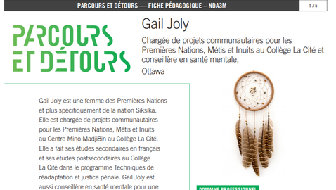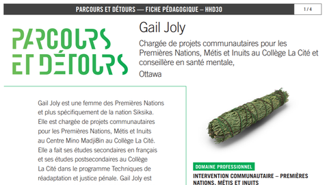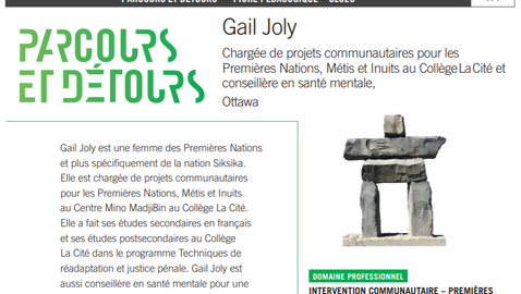 Entrevue : Gail Joly nous parle de son métier de chargée de projets et d'intervenante communautaire. Un intervenant communautaire qui travaille avec les Premières Nations, Métis et Inuit a de bonnes connaissances de la culture des communautés avec lesquelles il interagit. Un intervenant communautaire offre des services d'intervention, de prévention et d'accompagnements directs à la clientèle visée au sein de la communauté. Il organise des activités et événements pour favoriser un sentiment de bien-être et d'appartenance. Les actions d'un intervenant communautaire peuvent se faire individuellement ou en groupe. Même si la majorité du travail consiste à travailler directement avec la clientèle, un intervenant communautaire est aussi appelé à rédiger des rapports d'activités et autres documents administratifs.