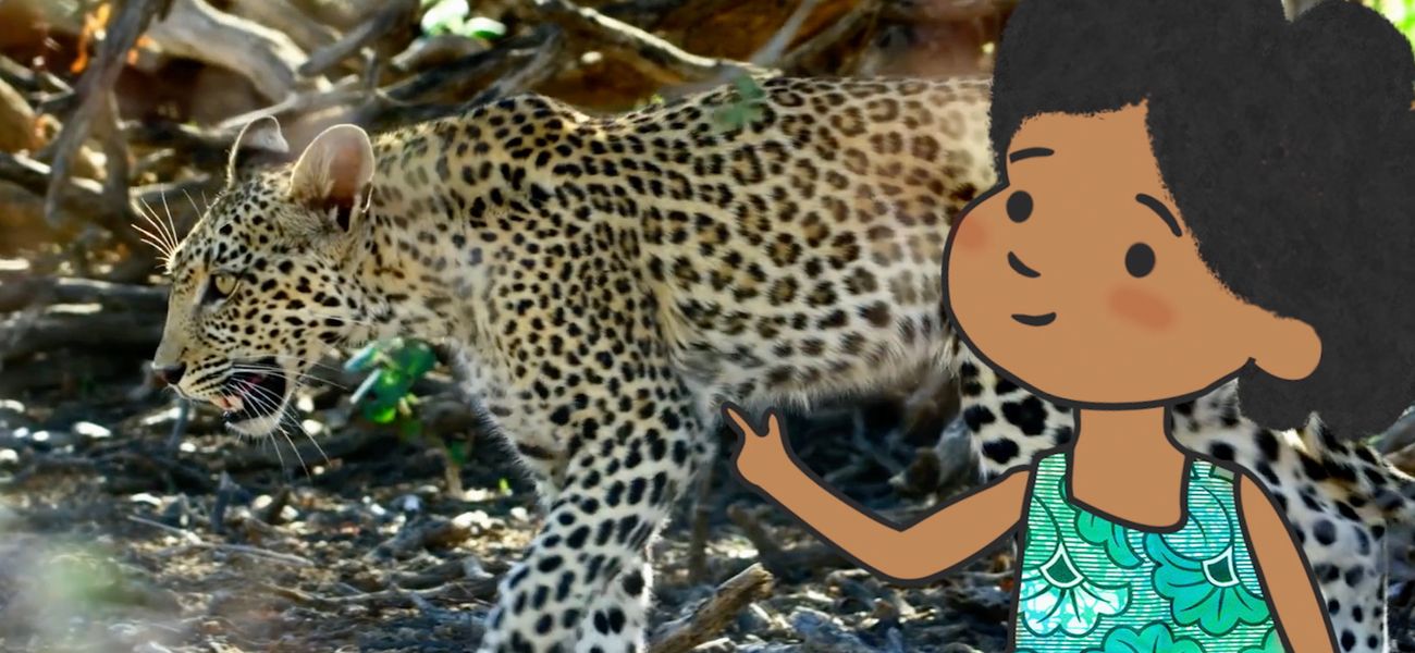 Bonjour le léopard! Tu fais partie de la grande famille des félins, c'est la même famille que les chats. D'ailleurs, tu leur ressembles, mais en beaucoup plus grand! Ton autre nom, c'est la panthère… La panthère noire est d'ailleurs un léopard dont les poils sont très foncés, mais si on regarde bien on s'aperçoit qu'elle aussi est tachetée!