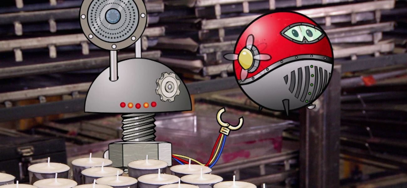 Pat et Bibi visitent une manufacture de bougies. Ils découvrent la façon dont différentes bougies sont produites. Ils font des observations sur l'état de la matière et l'ajout de substances à la cire pour créer un mélange.