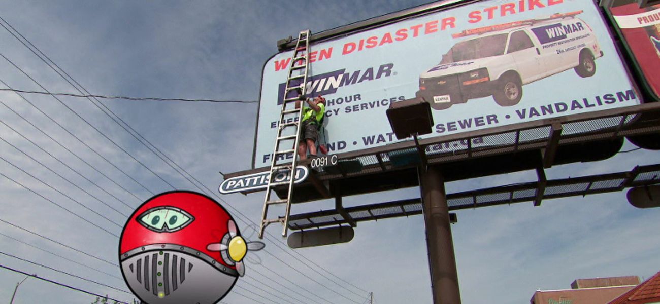 À l'aide d'une imprimante géante, Pat et Bibi expliquent comment on imprime les affiches qui se retrouvent sur le très haut panneau d'affichage.