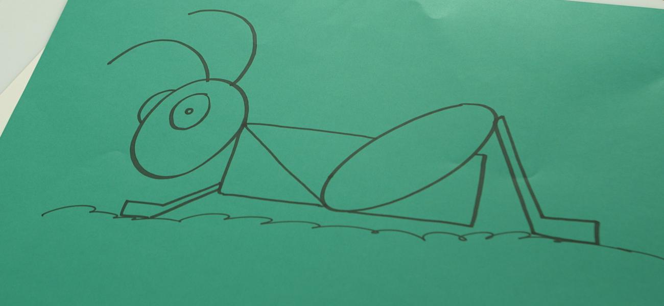 Tristan se sert de formes géométriques pour dessiner une sauterelle.