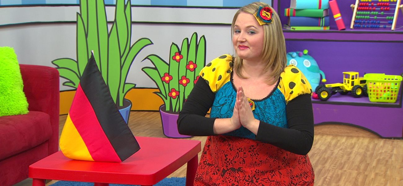 Josée trouve le drapeau de l'Allemagne sous la tente et récite la comptine « Am stram gram » en invitant les enfants à chanter et à faire les mouvements avec elle.