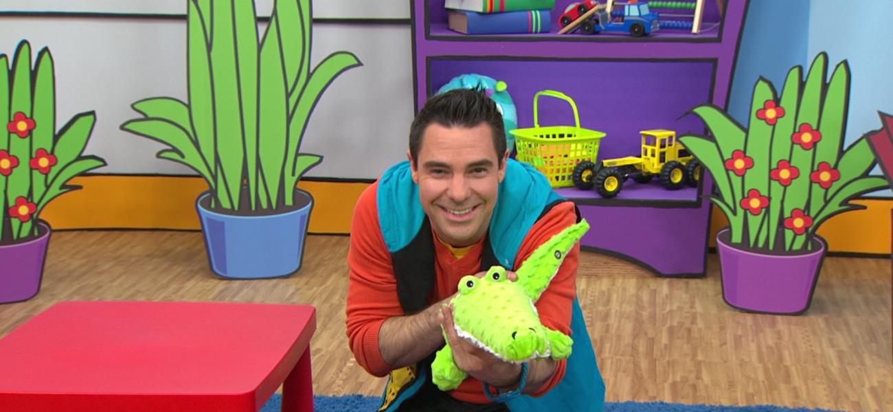 Louis trouve un crocodile en peluche sous la tente et récite la comptine « Les crocodiles » en invitant les enfants à chanter et à bouger avec lui.