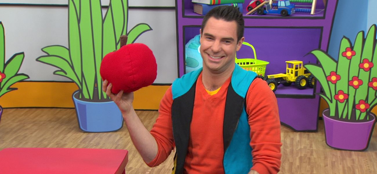 Louis trouve une pomme sous la tente et récite la comptine « Pomme de reinette » en invitant les enfants à chanter et à bouger avec lui.