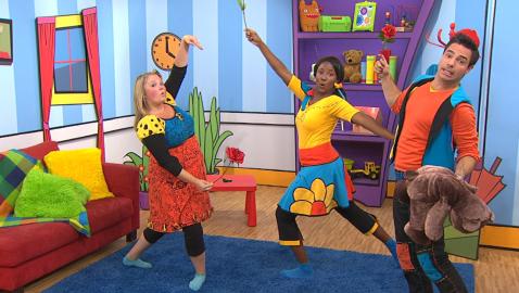 Josée, Lexie et Louis encouragent les élèves à danser avec eux ainsi qu?à faire la statue lorsque la musique arrête.