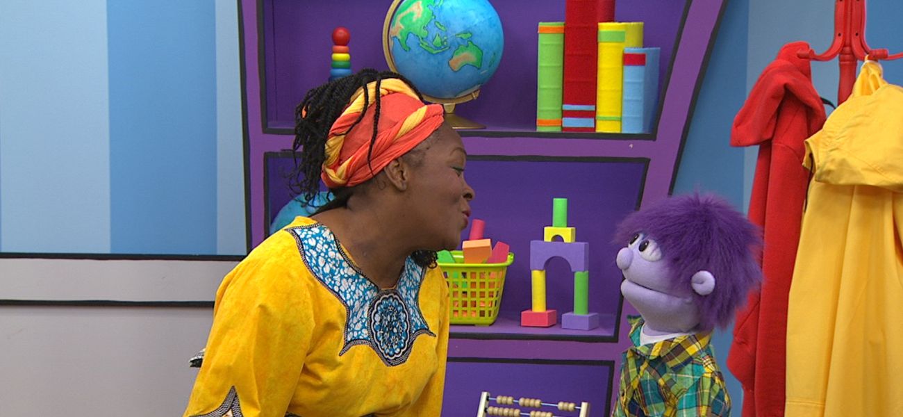 Madame Bonheur danse et chante des comptines à l'enfant. Elle fait des mouvements sur la comptine «Le petit ver de terre» avec Charlie et les amis.