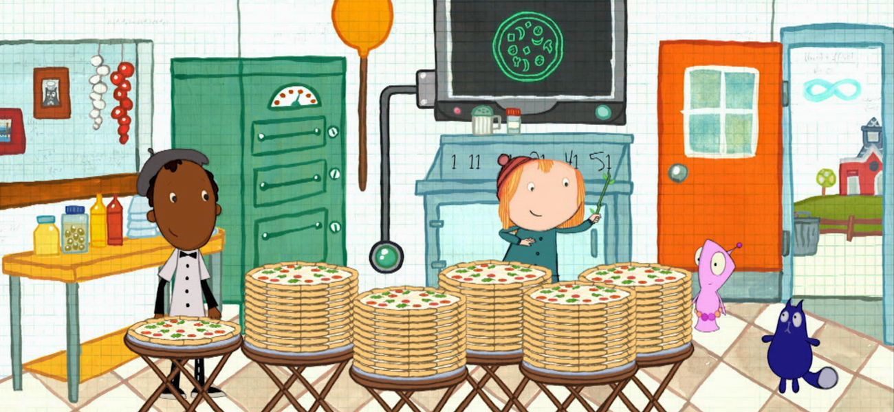 Peg et Chat doivent cuisiner un grand nombre de pizzas pour les clients. Ils décident de partager une pizza avec la bande de pirates en dix parts égales.