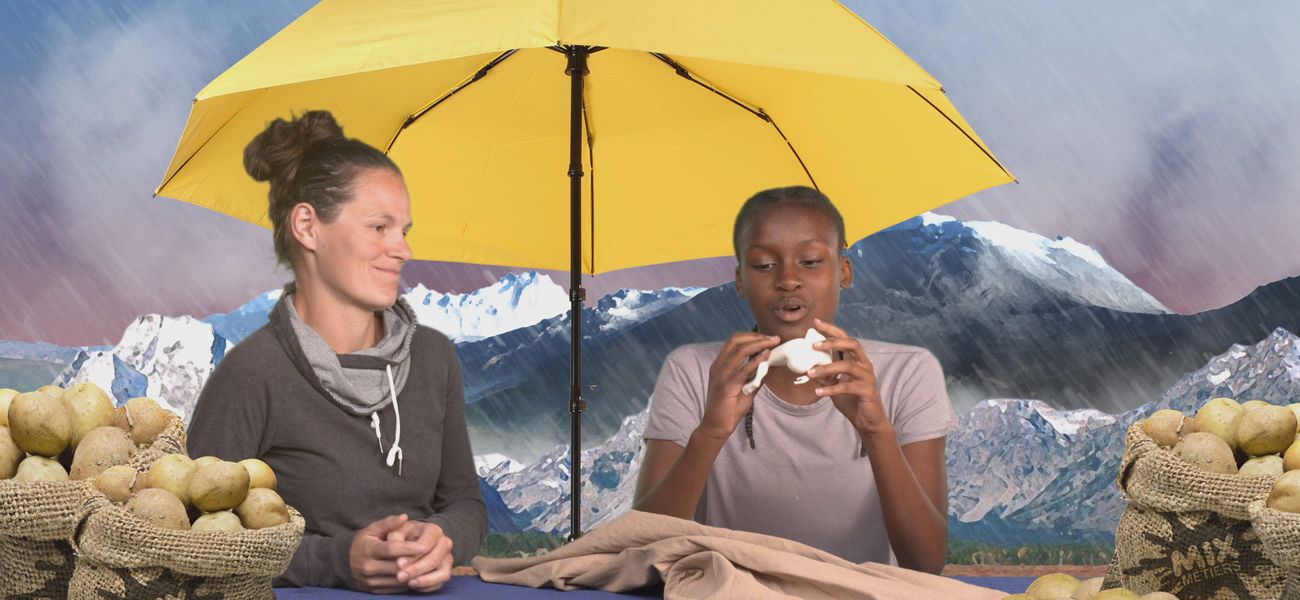 Seana essaie d'identifier les objets qu'Annick D'Auteuil a mis dans la poche à patates.