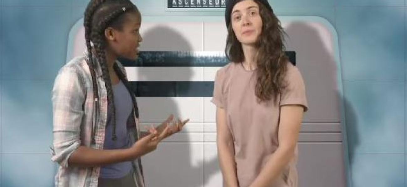 Le temps d'une montée en ascenseur, Annie Guglia doit 'pitcher' les caractéristiques de son métier d'athlète de planche à roulettes professionnelle à Seana pour la convaincre qu'il s'agit bien d'un emploi fascinant!