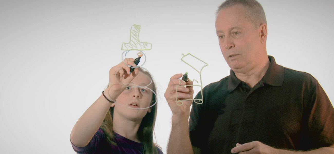 ·Camille et son papi Paul dessinent un souvenir qu'ils partagent, la construction d'un bonhomme de neige, et racontent l'événement.