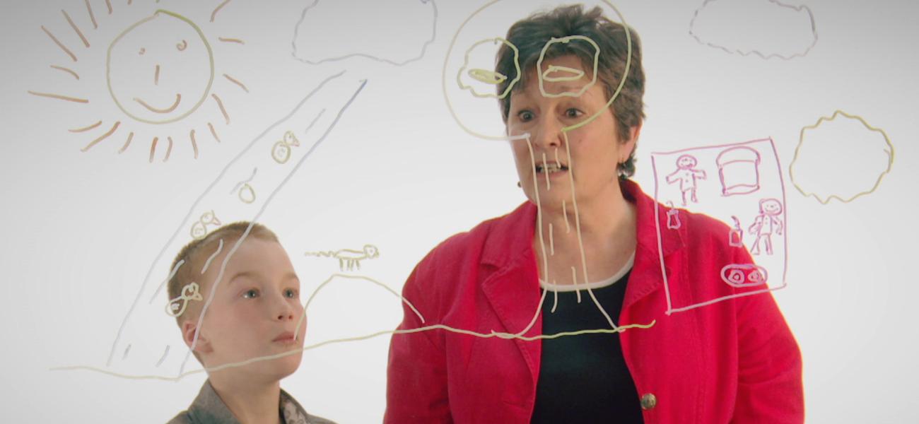 ·Dominic et sa mamie Ginette dessinent un souvenir qu'ils partagent, un pique-nique, et racontent l'événement.
