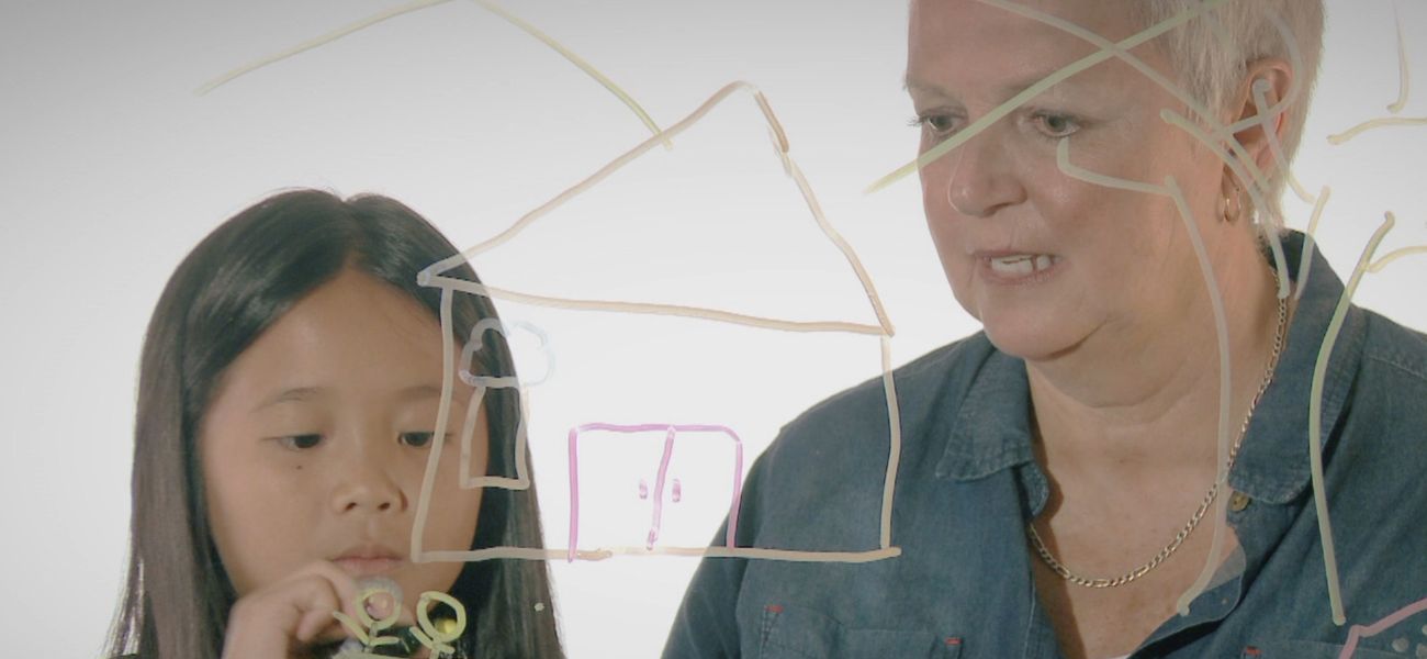 ·Ana-Bella et sa mamie Anne dessinent un souvenir qu'elles partagent, manger un cornet de crème glacée au chalet, et racontent l'événement.