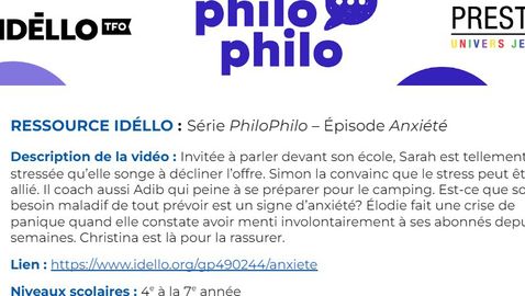 Invitée à parler devant son école, Sarah est tellement stressée qu'elle songe à décliner l'offre. Simon la convainc que le stress peut être son allié. Il coach aussi Adib qui peine à se préparer pour le camping. Élodie fait une crise de panique quand elle constate avoir menti involontairement à ses abonnés depuis des semaines. Qu'est-ce que l'anxiété? Allons voir ce que les jeunes ont à dire sur le sujet.
