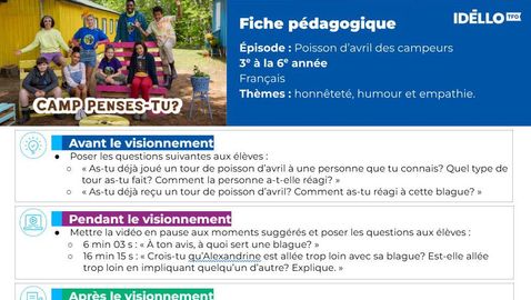 C'est le poisson d'avril des campeurs et Samir établit les critères pour juger qui fait la meilleure blague. Tout le monde participe, mais c'est la timide Alexandrine qui surprend tout le monde avec une performance inoubliable.