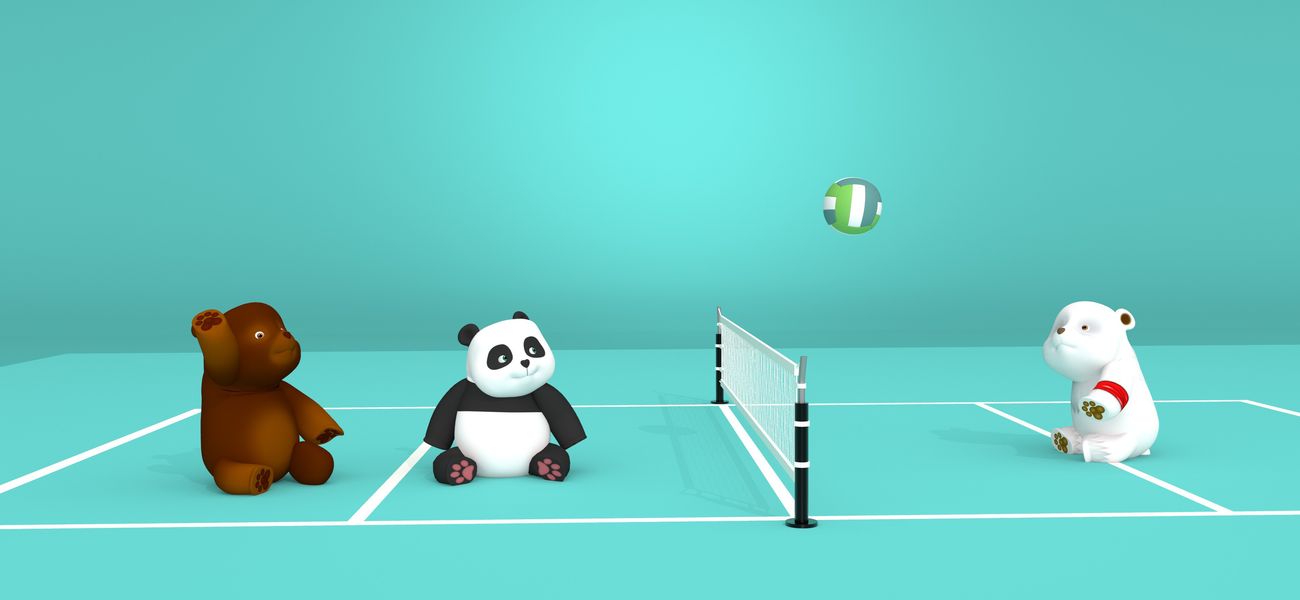 Ours Brun montre à Lilou Bambou à travailler en équipe pour empêcher le ballon de toucher le sol et éviter que l'autre équipe ne marque un point.