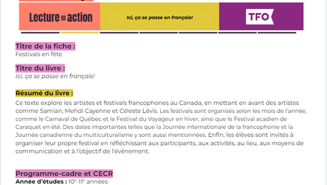 Ce texte explore les artistes et festivals francophones au Canada, en mettant en avant des artistes comme Samian, Mehdi Cayenne et Céleste Lévis. Les festivals sont organisés selon les mois de l’année, comme le Carnaval de Québec et le Festival du Voyageur en hiver, ainsi que le Festival acadien de Caraquet en été. Des dates importantes telles que la Journée internationale de la francophonie et la Journée canadienne du multiculturalisme y sont aussi mentionnées. Enfin, les élèves sont invités à organiser leur propre festival en réfléchissant aux participants, aux activités, au lieu, aux moyens de communication et à l’objectif de l’événement.